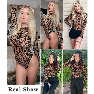 Show moreIntroducing the Avidlove Long Sleeve Lingerie Snap Crotch Bodysuit, an exquisite blend of style, comfort, and versatility. Made from a luxurious fabric that combines 95% Polyester and 5% Spandex, this bodysuit offers a remarkable stretch that ensures a perfect fit without compromising on shape or quality. The eye-catching geometric flock print adds a touch of edgy sophistication, making it a staple piece for both casual outfits and glamorous nights out. Designed for easy wear, the snap closure feature allows for effortless dressing and undressing, making it convenient for any occasion.