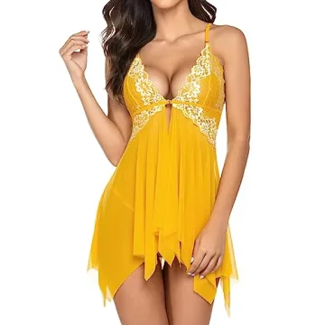 Show moreIntroducing the Avidlove Women Lingerie Lace Babydoll Chemise Halter Sleepwear Nightwear, a stunning piece designed for the modern woman who wants to feel beautiful, confident, and alluring. This exquisite yellow negligee dress combines delicate lace and mesh to create a tantalizing silhouette that flatters all body types. With its asymmetrical hem, this piece elongates your legs, while the adjustable spaghetti straps ensure a perfect fit that hugs your curves in all the right places. Featuring captivating bicolor floral lace cups, the true beauty of this lingerie is showcased, drawing the eye and heightening desire.