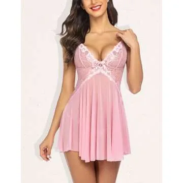 Avidlove Women Lingerie Lace Babydoll V Neck Sexy Sleepwear Strap Chemise with Side Slit Pink