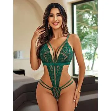 Avidlove Women Lingerie Lace Bodysuit Deep V Teddy One Piece Lace Babydoll Dark Green Medium