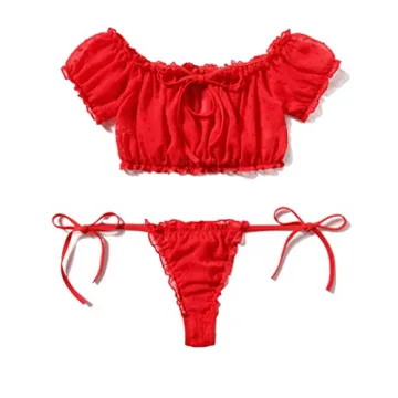Show moreStep into a realm of elegance and allure with the Avidlove Women's Lingerie Self Tie Ruffle Trim Dobby Teddy Mesh Lingerie Set. This exquisite red bra and panty set is meticulously crafted from 100% polyester, ensuring a plush feel against your skin. Designed for both beauty and comfort, this sexy lingerie ensemble is perfect for those special moments or cozy nights in. Featuring a unique off-shoulder style, the bra boasts short sleeves paired with an elastic waistband for a fit that highlights your feminine silhouette flawlessly. The charming self-tie bow closure not only adds a touch of sophistication but also allows for easy adjustments to achieve your perfect fit.