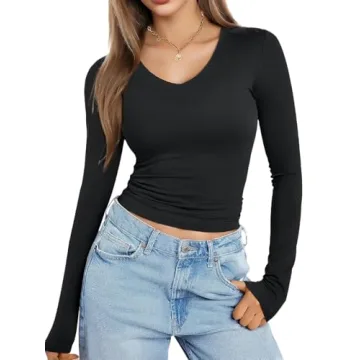 The trend-driven design makes this top a versatile addition to your collection. It pairs fantastically with jeans, skirts, or pants, making it suitable for various occasions, from casual outings to professional settings. The long sleeves provide a balancing act against the alluring neckline that adds femininity and sophistication to your silhouette. Available in several solid colors, this top can easily transition from daytime wear to evening glam, allowing you to express your unique style throughout the day.