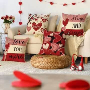 Show more Introducing the AVOIN colorlife Valentine's Day Hugs and Kisses Love You More Throw Pillow Covers, a charming addition to your home decor for the love-filled season! Perfectly crafted in a stylish 18 x 18 inch size, these pillow covers are designed with romantic heart stripes that exemplify affection and warmth. Made from 100% durable polyester, they are not only machine washable but also resistant to fading, bleeding, and fraying, ensuring long-lasting beauty and function. Whether adorning your sofa, couch, or any special corner of your home, these cushion cases will provide a sweet backdrop for your Valentine’s and everyday celebrations.