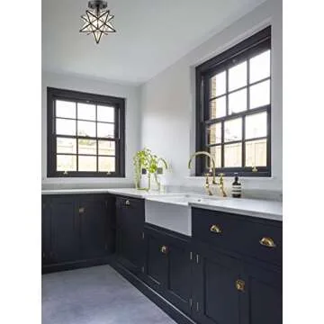 Show moreThe AXILAND Moravian Star Light Flush Mount Ceiling Light is the perfect addition to any modern home, combining functionality with an eye-catching design. Featuring a stunning star silhouette crafted from durable iron with a black finish, this ceiling light is not just a source of illumination but a statement piece that enhances your interior decor. The seeded glass panels beautifully diffuse light, creating a warm and inviting atmosphere wherever it is installed.