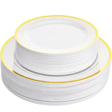 Show moreIntroducing the **Aya's 60 Gold Rimmed Plastic Plates Set**, a perfect blend of elegance and practicality designed for your next gathering! This set includes **30 dinner plates** (10 inches) and **30 appetizer plates** (7.5 inches), so you're all set to host up to **30 guests** without breaking a sweat. Crafted with a heavy-duty construction, these plates exemplify durability while maintaining an upscale appearance. The stunning **gold rim** adds a touch of luxury that mimics the look of fine china, making them ideal for both casual and formal events, whether it's a wedding, birthday, or a simple family celebration.