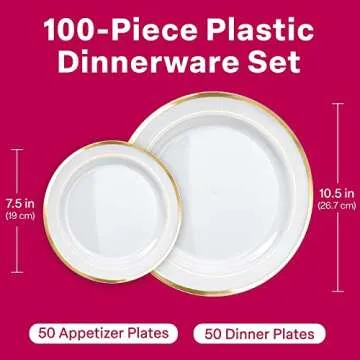 Show more Transform your gatherings into elegant affairs with our exquisite disposable plates set, specifically designed to serve 50 guests with ease and style. This comprehensive set includes 50 large dinner plates and 50 smaller plates, perfect for appetizers, salads, and desserts. You’ll never have to worry about running out of plates during your celebratory events!