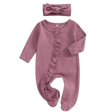 Show moreIntroducing the Ayalinggo Newborn Baby Girl Fall Winter Outfit—the ultimate fusion of comfort and style designed for your little princess! Crafted from high-quality, 100% organic cotton, this adorable jumpsuit promises to keep your baby snug and warm during the colder months. Its charming ruffled detailing on the side adds a touch of playful elegance while the easy snap buttons at the bottom make dressing a breeze for parents. Styled in a delightful purple hue, this jumpsuit also boasts textured cable-knit footies that feature mitten cuffs, ensuring tiny hands are kept warm and cozy.