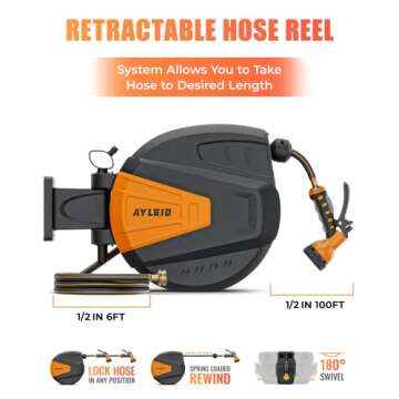 Show more Transform your gardening experience with the Ayleid Retractable Garden Hose Reel, a perfect blend of convenience and efficiency designed for every outdoor enthusiast. This wall-mounted hose reel features a robust 100-foot 1/2 inch hose that retracts smoothly and is equipped with an ingenious auto rewind mechanism. When you’ve pulled the hose to your desired length, it securely locks in place to avoid tangles while providing stress-free usage. With a sleek black finish designed to seamlessly integrate with your outdoor aesthetic, it’s not just a functional tool - it’s an elegant addition to your garden decor!