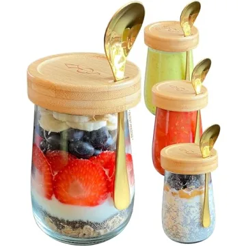 AYOS Premium Overnight Oats Containers with Bamboo Lids and Golden Spoons - 16 oz Glass Jars - 4 pack - Plastic Free