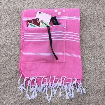 Show more Introducing the ultimate beach companion that revolutionizes your sun-soaking experience, the Aysesa Turkish Towel! Weighing in at just 11.5 oz, it is lighter than traditional terry towels, yet equally absorbent. Made from long-fibered raw Turkish cotton, this towel showcases fast-drying capabilities, ensuring that it’s ready to use after every shower or swim without that dreaded musty odor. Enjoy a sand-free beach day with its clever design, minimizing the terry loops that trap sand, allowing you to simply shake it off and relax.