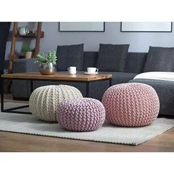 Show moreTransform your living space with the AZK Hand Knitted Cable Style Dori Pouf, a stunning floor ottoman that blends functionality and charm for any home. Handmade by skilled artisans, each pouf showcases meticulous craftsmanship through its intricate cable-knit design, ensuring that every piece is not only unique but also a work of art. Crafted from 100% cotton braid cords, this pouf offers a cozy and welcoming seat or footrest while retaining exceptional durability to withstand daily use. Measuring at a versatile 18x18x13 inches, it fits seamlessly into various settings, from living rooms to nurseries, making it an ideal choice for enhancing your decor lived-in style.