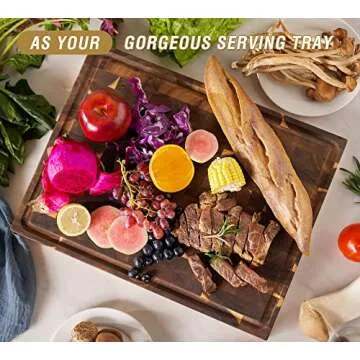 Show more Introducing the AZRHOM Large Thick End Grain Acacia Wood Butcher Block, your indispensable kitchen companion! Measuring a generous 17x13x1.5 inches, this beautifully crafted cutting board is not only a stylish kitchen accessory but also highly functional. Made from sustainably sourced acacia hardwood, it offers an eco-friendly option that is gentle on your knives while remaining incredibly durable. Rest assured, this board is built to last, and its stunning medium wood color enhances the aesthetic of any kitchen. Designed with thoughtful features like a deep juice groove on one side, this board efficiently catches liquids, keeping your countertops clean and mess-free. Plus, the built-in handles make it easy to lift and move, whether you're chopping vegetables or serving up a delicious charcuterie board to guests.