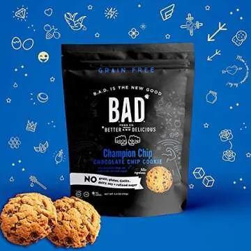 Show more Indulge guilt-free in the delightful taste of B.A.D. FOOD CO's Champion Chip Chocolate Chip Cookies. These cookies are a marvelous blend of nostalgia and modern nutrition, crafted for cookie lovers who cherish health as much as flavor. Gone are the days of sacrificing your well-being for a sweet treat; our cookies are made with love and real food ingredients that will take you back to Grandma's kitchen while keeping your body happy. Enjoy a wholesome snack that doesn't compromise on taste, made without grains and loaded with scrumptious chocolate chips sweetened with natural ingredients.