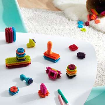 B. toys- Bristle Block Stackadoos - Building Blocks for Kids – Developmenal Toy-68 Blocks in a Storage Pouch – STEM Toys – Soft & Interlocking – Bristle Block Stackadoos – 2 years +