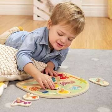 Invest in the B. toys Stomping Dinos Wooden Peg Puzzle today and watch your little one engage in valuable developmental play!