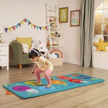 Show more The Tumbling Mat is a fantastic playtime solution crafted specifically for young movers, featuring vibrant colors and playful animal illustrations. With numbers 1 to 7 embedded for a fun hopscotch game, this mat is designed not only to inspire creativity but also to encourage physical activity in children. Made by a renowned brand, it embodies durability while remaining soft to cushion falls during play. Its foldable design makes it incredibly portable, allowing kids to easily carry it with the built-in handle, ensuring effortless storage when playtime is over.