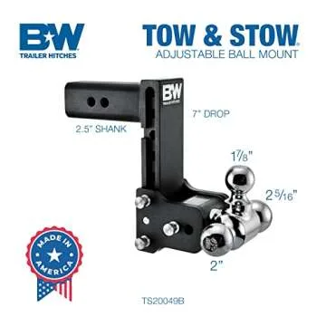 B&W Trailer Hitches Tow & Stow Adjustable Trailer Hitch Ball Mount - Fits 2.5" Receiver, Tri-Ball (1-7/8" x 2" x 2-5/16"), 7" Drop, 18,000 GTW - TS20049B