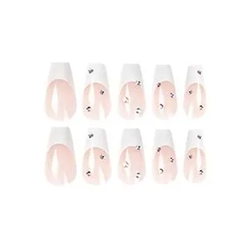 BABALAL Coffin Press on Nails Medium Fake Nails with Nail Glue Nude White French Tip Glossy Glue on Nails 24pcs Ballerina Acrylic Nails with Rhinestones Designs False Nails for Women