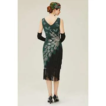 Show moreStep back in time with the mesmerizing peacock 20's dress, a unique creation from the renowned brand Babeyond. This exquisite dress is crafted from soft polyester and mesh fabric, adorned with shimmering beads and a stunning embroidered peacock pattern that adds a touch of vintage glamour. Designed with a zipper closure for effortless wear, this dress features a flattering bodycon style that hugs your curves beautifully. The elegant V-neck design at both the front and back offers a hint of sophistication, making it perfect for any special occasion.