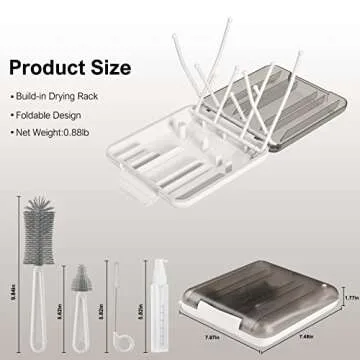 Show more Introducing the revolutionary 6-IN-1 Baby Cleaner Set, a complete travel solution designed specifically for busy parents on the go. This upgraded bottle brush set includes an extendable bottle brush, nipple brush, straw brush, soap dispenser, bottle drying rack, and a handy storage box. Engineered for optimal accessibility, the brushes reach those narrow openings and crannies, ensuring thorough cleaning without damage to your precious baby bottles.