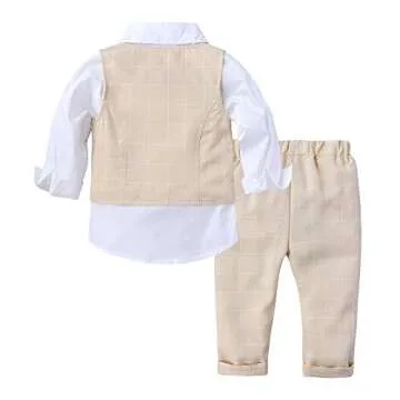 Baby Boys 3Pcs Gentleman Suit Kids Formal Outfits Set Bowtie Long Sleeve Shirt+ Tuxedo Vest+ Pants Beige