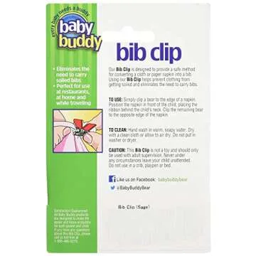 Show moreIntroducing the Baby Buddy Bib Clip, a game-changer for any parent navigating mealtime with little ones! Whether you're at home, enjoying a meal out, or embarking on a family adventure, this innovative clip transforms any cloth napkin or paper towel into a convenient bib. Say goodbye to the hassle of lugging around multiple traditional bibs and embrace the ease of cleaning up after meals with this stylish solution. Perfectly designed for every busy parent, the Baby Buddy Bib Clip boosts functionality while adding a touch of whimsy to your child's feeding experience!