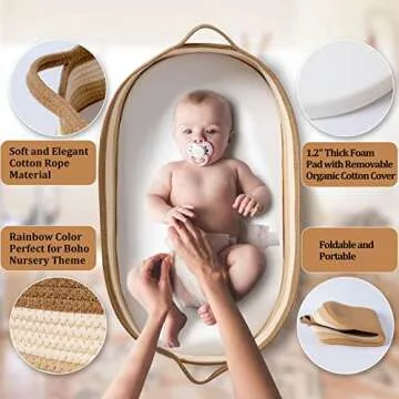 Baby Changing Basket - Moses Basket Changing Table Topper and Thick Foam Pad with Removable Cotton Mattress Cover, 100% Cotton Boho Nursery Decor with Storage Bag