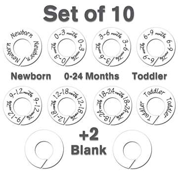 Show more Organize your baby’s wardrobe with our beautifully designed Baby Closet Dividers - Set of 10, encompassing sizes from Newborn all the way to Toddler, including 2 extra blanks for personal customization. Crafted from high-quality, eco-friendly PS plastic, these dividers are not just a functional accessory but an essential tool for any new mom looking to streamline her baby's clothing arrangement. Each piece is printed on both sides, ensuring that the size labels are always visible, making it easier than ever to find the perfect outfit in a hurry.