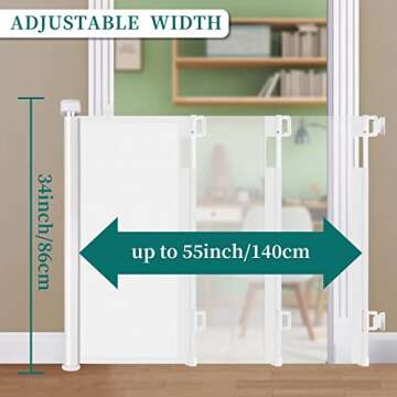Show moreThe Retractable Mesh Baby Gate is the ideal solution for parents seeking safety and versatility in childproofing their home. Designed to secure spaces both indoors and outdoors, this innovative baby gate extends up to 55 inches wide and stands an impressive 33 inches high. Crafted from durable materials, it features a unique tension mechanism that automatically tightens the mesh gate upon locking, providing a safer environment for your little explorers and pets. With its exceptional ability to accommodate irregular walls through adjustable lower wall spacers, this baby gate ensures minimal space above the ground, significantly reducing the risk of crawling underneath. Elegantly designed in a sleek white finish, it seamlessly blends with any home décor while offering utmost functionality.