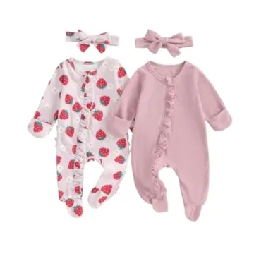 Baby Girl Footies Newborn Zipper Sleeper 2 Pack Ruffle Pajamas Romper Coming Home Outfit (Pink&Strawberry,0-3 Months)
