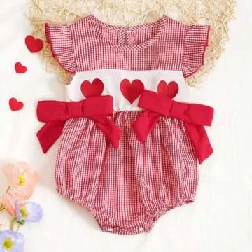 Baby Girl Valentines Outfit Newborn Heart Plaid Bubble Romper Bowknot Ruffle Bodysuit Smocked Baby Clothes (Red, 12-18 Months)