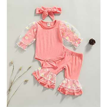 Show moreIntroducing the adorable Baby Girls Bell Bottoms 3Pcs Daisy Outfits Mesh Patchwork Playsuit, specifically designed for little fashionistas aged 3 to 6 months. This charming ensemble is made from premium quality cotton fabric that is not only breathable but also impressively soft, ensuring all-day comfort for your precious little one. The stylish design features an enchanting daisy lace mesh patchwork that brings a splash of whimsy to any outfit. With long sleeves and convenient snap buttons, changing becomes effortless while maintaining your babe's flair. The solid color headband adds a wonderful finishing touch, making this outfit perfect for any occasion.