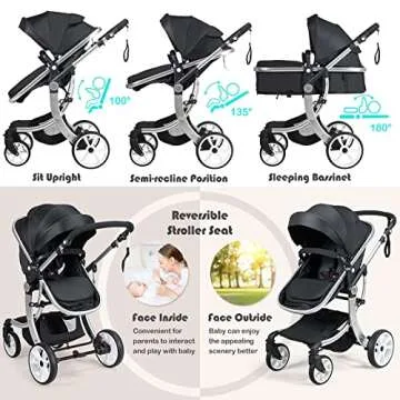 BABY JOY 2-in-1 High Landscape Baby Stroller, Reversible Bassinet Reclining Stroller, Foldable Push Chair w/Adjustable Canopy, Storage Bag, Foot Cover, Rain Cover & Net, Aluminum Alloy Frame (Black)