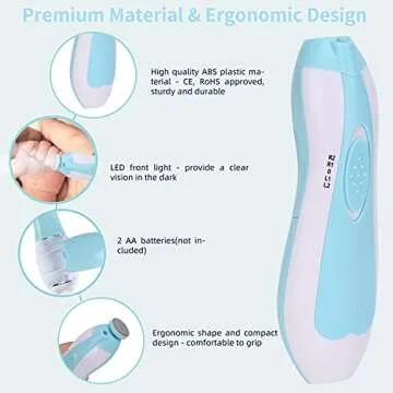 Show moreThe Baby Nail Clipper is a revolutionary electric nail trimmer designed specifically for the delicate nails of your newborn and growing children. Its ergonomic design allows parents to easily and safely trim their babies' nails without the fear of nicks or cuts. With a soft LED light that illuminates your little one’s tiny fingers, you can navigate their nails even in dim lighting. This safe, gentle trimmer makes a soothing whirring sound that helps keep your baby calm while you care for their nails. Plus, the compact design makes it incredibly portable, ensuring that you can keep your baby’s nails neat wherever you go. This product is not just for infants; it’s versatile enough to be used for toddlers and even adults, making it a family-friendly grooming tool! Less