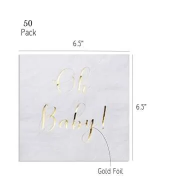 Show more Welcome to the perfect finishing touch for your memorable baby shower! Our Baby Shower Napkins - 50 Pack Disposable Paper Luncheon Cocktail Napkins with Foil "Oh Baby!" are designed to enhance every aspect of your celebration. Featuring a stunning 2x2ply quality, these charming napkins bring both elegance and practicality to your event. Measuring a generous 6.5" x 6.5", they are perfectly sized for all your culinary delights—be it lunch, dinner, or dessert. With a delightful white backdrop accented by luxurious gold foil, our napkins will add a stylish flair to your decor, universally appealing for gender-neutral baby showers. Whether adorning your buffets or elevating your table settings, these napkins promise to impress the guests while being functional and durable enough to handle any spills.