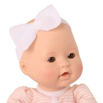 Show more Introducing Baby Sweetheart, an enchanting addition to any child's toy collection. This huggable and soft baby doll, crafted by the renowned Battat brand, is designed perfectly for little hands with a size of 12 inches, making it easy for toddlers to carry, cuddle, and care for. With its adorable newborn look, Baby Sweetheart effortlessly brings the joys of nurturing right into your child's playtime. The cuddly polyester body ensures it's not just a doll but a lifelong companion for love-filled adventures and heartfelt moments shared between children and their cherished toys.