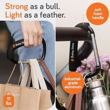 Show moreIntroducing the Baby Uma XL Stroller Hooks for Bags, the ultimate solution for parents and caregivers who value convenience and functionality during outings with their little ones. Designed with practicality in mind, each extra-large carabiner clip measures 6.7" x 4", offering ample space to securely hold all your baby accessories like diaper bags, lunch packs, and even grocery bags directly on your stroller handle. Crafted from durable yet lightweight aluminum, these hooks can support up to 11 lbs each, making it easy to carry everything you need for a day out.