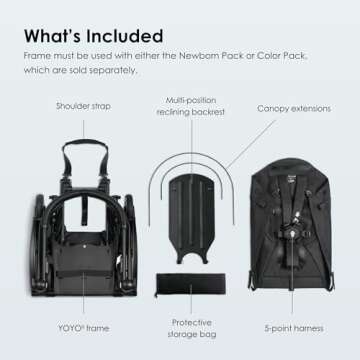 Babyzen YOYO2 Stroller Frame, Black - Includes 5-Point Harness, Multi-Position Reclining Backrest, Canopy Extensions, Padded Shoulder Strap & Protective Storage Bag