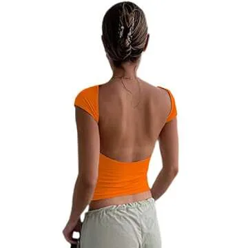 Backless Tops for Women Sexy - Casual Y2K Crop Shirts Short Sleeve Crewneck Slim Fit Cut Out Tees Orange M