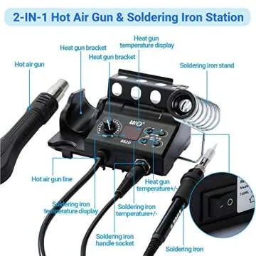 Show moreIntroducing the BACOENG 2 in 1 882D Soldering Iron Hot Air Rework Station! This innovative tool combines the versatility of both a digital soldering iron and a hot air gun, specifically engineered for electronics enthusiasts and professional technicians alike. With an impressive power rating of **750W**, this dual-function station can handle everything from delicate component repairs to heavy-duty soldering projects with utmost precision. The soldering iron operates across an extensive temperature range of **392°F to 896°F**, accommodating various needs for both intricate work and robust applications.