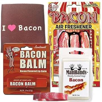 Show moreIf you know someone who cannot survive without bacon, the Bacon Addicts Survival Kit Gift Pack is the ultimate gift! This delightful 5-piece set is packed full of bacon-themed goodies that will bring a smile to any bacon lover's face. From the moment they unwrap it, they’ll be engulfed in the irresistible aroma of Bacon Soap and greeted with the quirky charm of Bacon Air Freshener. This set includes Bacon Lip Balm to keep their lips tasty, an I Heart Bacon Can Cooler to keep their drinks cold, and an eye-catching Bacon Addict Silicone Wristband to proudly proclaim their love for this savory treat!