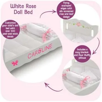 Show moreIntroducing the Badger Basket Doll Bed with Bedding, an enchanting addition to your child's playroom that combines elegance with imaginative fun. Designed specifically for dolls up to 20 inches, including popular brands like American Girl and Our Generation, this doll bed is a dream come true for youngsters who love role-playing and household scenarios. The beautiful white and pink rose design adds a touch of sophistication, ensuring that this bed will enhance any room decor and become a cherished piece in your child's collection. Complete with a removable padded blanket and four decorative pillows, it transforms playtime into a cozy adventure.
