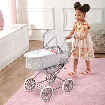 The overall dimensions of approximately 30 inches in length, 15.5 inches in width, and 32 inches in height, along with a handle height of 26 inches, make this pram perfectly sized for children. Its sleek design and charming aesthetic are sure to captivate any young doll enthusiast. Plus, it's easy to assemble—just attach the wheels and unfold it, and your little one is ready to roll!