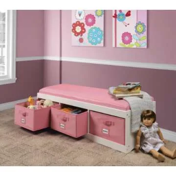 Badger Basket Kids’ Storage Bench with Cushion and 3 Bins – White with Pink, Durable and Comfortable Seating