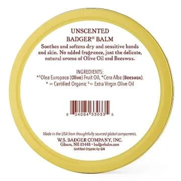 Show more The Unscented Badger Balm is a remarkable skin care solution designed specifically for those suffering from dry, cracked, or weathered skin. With a simple formula that includes just two potent ingredients—USDA certified organic Extra Virgin Olive Oil and Organic Beeswax—this balm provides a rich, deeply moisturizing experience suited for use anywhere on the body. Unlike other moisturizers, this balm is notably fragrance-free, making it ideal for people with sensitivities to scents or essential oils.