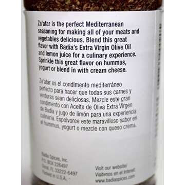 Show moreDiscover the vibrant taste of the Middle East with our exquisite Za'atar (Zaatar) seasoning blend by Badia. This delightful mixture is crafted from the finest ingredients, including sumac, sesame seeds, and a symphony of spices, making it a staple in Mediterranean cuisine. Perfectly versatile, Za'atar can elevate your meats, enhance your hummus, or add a unique twist to your yogurts. Simply blend it into cream cheese for a delectable spread, or sprinkle it over roasted vegetables for an extra flavor boost.