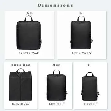 Each set comes complete with a versatile assortment of sizes—ranging from 1XL (17.5x12.75x4”) to a convenient Shoe bag. This thoughtful variety enables you to categorize outfits efficiently or separate your belongings by types, ensuring organization for every adventure. Whether you’re packing an entire family’s gear or just your essentials for a weekend getaway, these cubes cater to all your packing needs.