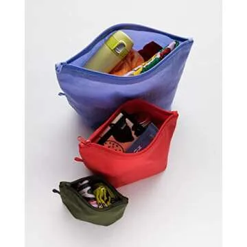 While many travel pouches exist on the market, the BAGGU Go Pouch Set stands out thanks to its eco-friendly materials, expandable sizes, and vibrant colors that cater to various styles and preferences. Unlike lined pouches, which are often difficult to clean, this set is unlined and easy to maintain. Reviewers praise the durability and functionality of BAGGU's products, indicating superior craftsmanship and thoughtful design compared to generic brands. This pouches set offers excellent value for those seeking quality and style.
