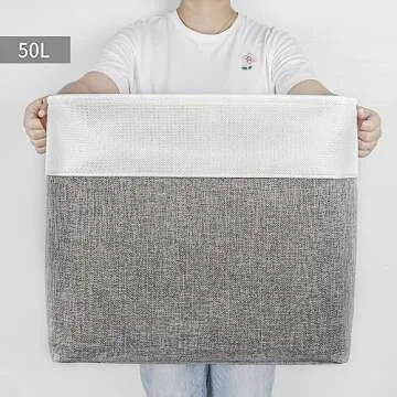 Show more Introducing the **Bagnizer Large Fabric Storage Baskets**, a must-have set that transforms cluttered spaces into organized sanctuaries while adding a splash of style to your home! These exceptional storage solutions are designed to hold everything from toys and clothes to office supplies and linens, making them perfect for any room in your house. Measuring a generous 17” (L) x 12” (W) x 15” (H), they not only offer sizeable storage but do so with elegance, thanks to their modern yet timeless design in neutral grey and white linen. Crafted carefully with high-quality materials, these baskets are reinforced with a durable metal rod frame, ensuring they stand the test of time even when packed to their full capacity.
