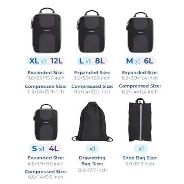 Show more Discover the ultimate travel companion with the BAGSMART 6 Set Compression Packing Cubes. Designed for savvy travelers who appreciate organization and efficiency, this innovative packing solution allows you to keep your belongings superbly arranged while maximizing luggage space. Each set includes an extra-large cube measuring 11.6'' x 15.9'', a large cube (9.2'' x 13''), a medium cube (8.2'' x 11.4''), a small cube (6.5'' x 9.0''), along with a drawstring bag and a shoe bag. These cubes cater to all your packing needs, whether you're on a weekend getaway or a month-long adventure.
